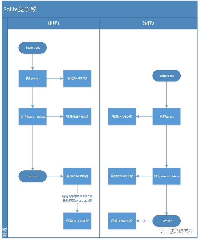 在之前的篇章中,我们介绍过sqlite的锁机制。从流程图上看来,似乎没什么太大的问题(事实上运行一段时间也没有出现问题) 但实际操作中,我们发现程序偶尔就出现卡死的情况。通过jstack可以看出来很多的线程处于BLOCK阶段。 从sqlite文件锁的机制来看。不应该发生死锁的情况吧? 深入了解一下情况,实际会发现这当中既有sqlite的问题,又有自己程序的问题,顺便更深入理解了一下sqlite锁的机制了。 我们可以通过以下流程图,看一下当两个线程竞争时造成的死锁问题: