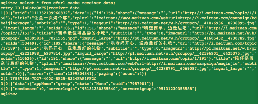 然而免费版的SQLite有一个致命缺点:不支持加密。这就导致存储在SQLite中的数据可以被任何人用任何文本编辑器查看到。比如国内某团购iOS客户端的DB缓存数据就一览无余:
