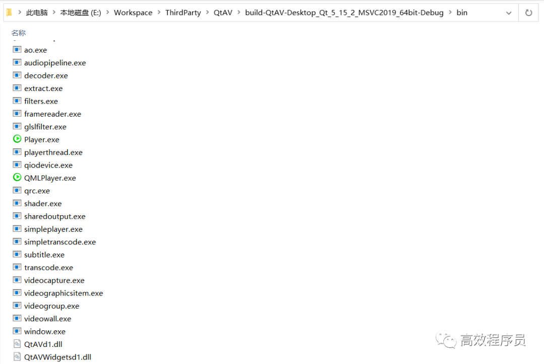 打开 QtAV.pro,执行 qmake -> 构建。完成之后,会生成相应的库文件和程序:
