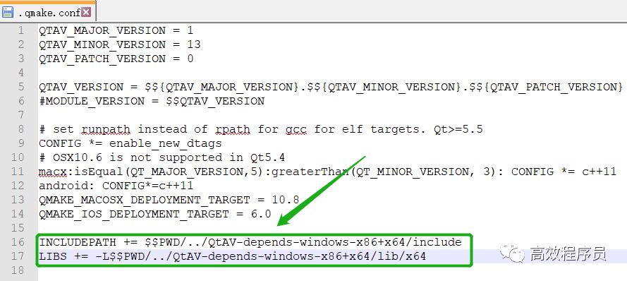 编辑 QtAV 源码目录中的 .qmake.conf文件,在其中添加以下 2 行内容: