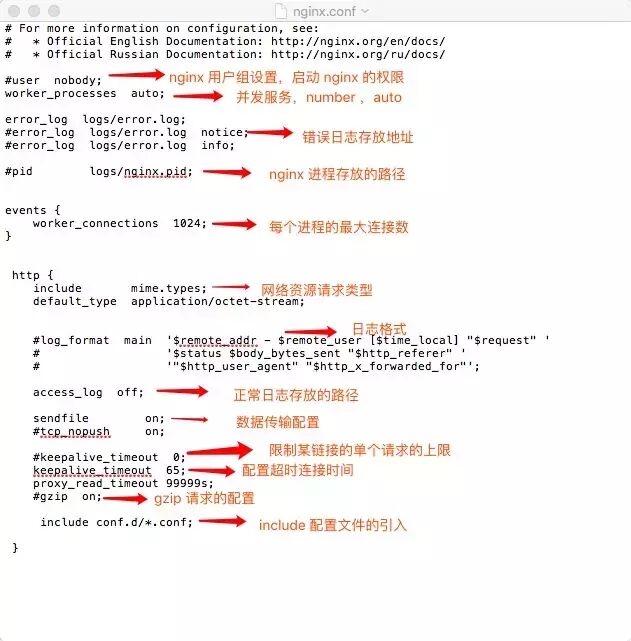 “负载均衡”在开发环境体现的不太明显,主要是为了解决生产环境的客户端请求很多的时候,动态的去分散给各个服务器,缓解服务器压力,充 分利用资源.而说到 “反向代理”,你的第一反应应该是”正向代理”,简称”代理”,你可以把代理想象成客户端和服务端的中介,代理的种类很多,比较常见的是,客户端对服务端进行请求的时候,代理会对请求的内容进行下载缓存,从而提高客户端的请求速度,代理还有多重代理,加密处理等功能,”反向代理”的作用和正项代理的功能相辅相成,原理也类似,反向代理将字符串和相应的服务器和端口匹配上,从而获取用户想要获取的内容,那么这两者的区分是什么呢,”正向代理”作用于客户端,”反向代理”作用于服务器. 生动的 nginx 反向代理解释为了让大家能够更加深刻的理解代理和反向代理的模式,我们引用下知乎上车小胖的回答 有了第三方订餐外卖平台(代理),老王懒得动身前往饭店,老王打个电话或用APP,先选好某个饭店,再点好菜,外卖小哥会送上门来。由于某个品牌的饭店口碑特别好,食客络绎不绝涌入,第三方订餐电话也不绝于耳,但是限于饭店接待能力有限,无法提供及时服务,很多食客等得不耐烦了,纷纷铩羽而归,饭店老总看着煮熟的鸭子飞走了,心疼不已。痛定思痛,老总又成立了几个连锁饭店,形成一个集群,对外提供统一标准的菜品服务,电话订餐电话400-xxx-7777,当食客涌入饭店总台,总台将食客用大巴运到各个连锁店,这样食客既不需要排队,各连锁店都能高速运转起来,一举两得,老总乐开了花,并为此种运作模式起名为“反向代理”(Reverse Proxy)。 nginx 基础配置好了,了解了 nginx 的一些概念之后,我们要开始切入今天的主题,”ngix 的基础配置”,安装好 nginx 配置之后,你对 nginx 的配置都写在 nginx.conf 的文件里,从 nginx 的配置指令作用域来讲,我们分为 5 个作用域块,分别是: - 全局作用域块