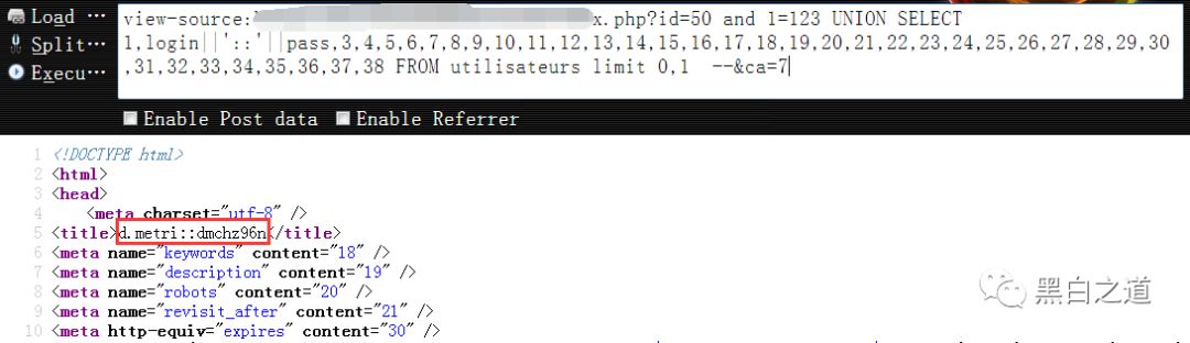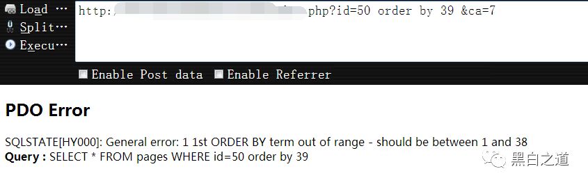 http://vuln.com/index.php?id=50 order by 39 &ca=7 个数为39时返回错误,说明当前表存在38个字段