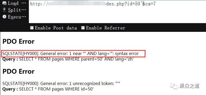 http://vuln.com/index.php?id=50 and 1=112 &ca=7 条件为假时,页面