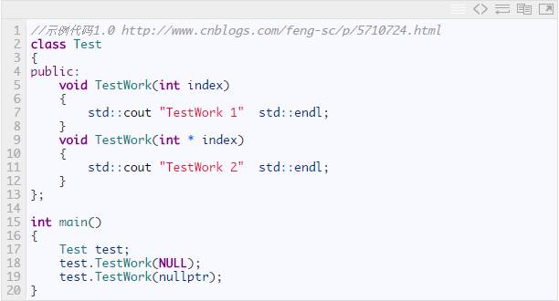 NULL在c++里表示空指针,看到问题了吧,我们调用test.TestWork(NULL),其实期望是调用的是void TestWork(int * index),但结果调用了void TestWork(int index)。但使用nullptr的时候,我们能调用到正确的函数。