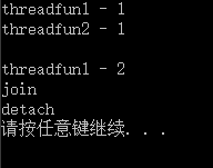 有以上输出结果可以得知,t1.join()会等待t1线程退出后才继续往下执行,t2.detach()并不会并不会把,detach字符输出后,主函数退出,threadfun2还未执行完成,但是在主线程退出后,t2的线程也被已经被强退出。