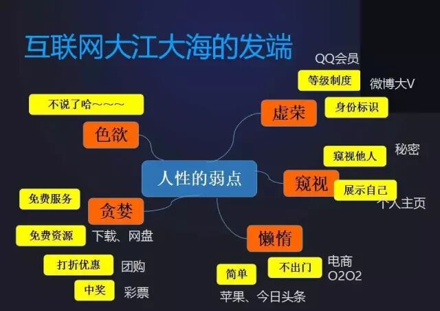 比如说你有没有满足用户的虚荣心?QQ会员的等级制度,微博的大V都是这类。比如你能让大家懒惰吗?去年崛起的O2O产品基本都是。
