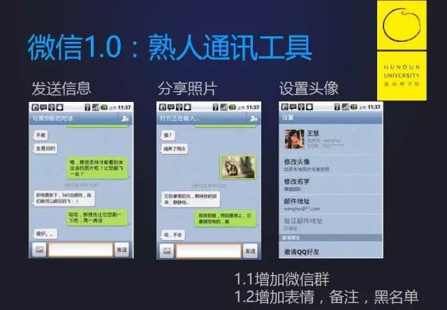 为什么说它的定义是熟人间的通讯工具呢?因为刚上线时只有三个功能:1,发送信息;2,发送图片;3,设置头像。