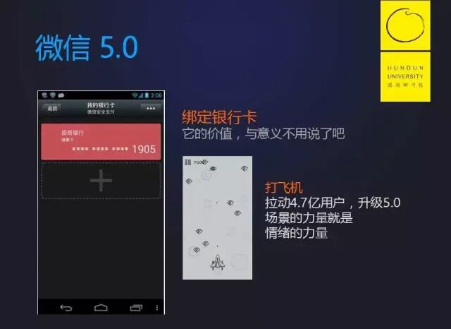 “打飞机”拉动了大家升级为5.0版本,让每个人的手机上拥有了绑定银行卡的能力,但是发红包让大家有了绑定银行卡的情绪。红包完成了微信支付从功能诉求到情绪诉求的转化。