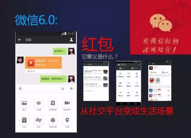“打飞机”拉动了大家升级为5.0版本,让每个人的手机上拥有了绑定银行卡的能力,但是发红包让大家有了绑定银行卡的情绪。红包完成了微信支付从功能诉求到情绪诉求的转化。